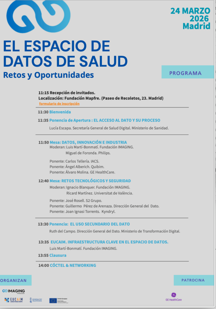 La jornada organizada en colaboración con EUCAIM, la Generalitat Valenciana y la Unión Europea, con el patrocinio de GE HealthCare, estará integrada por dos mesas de dabate y ponencias. Os dejamos con el programa